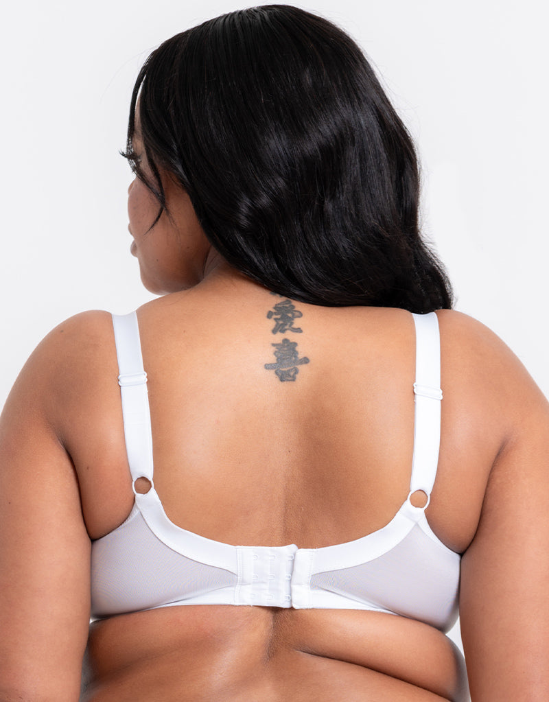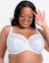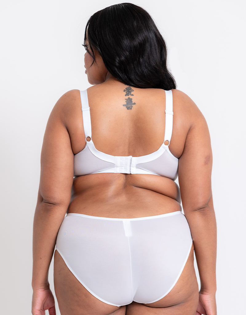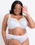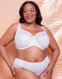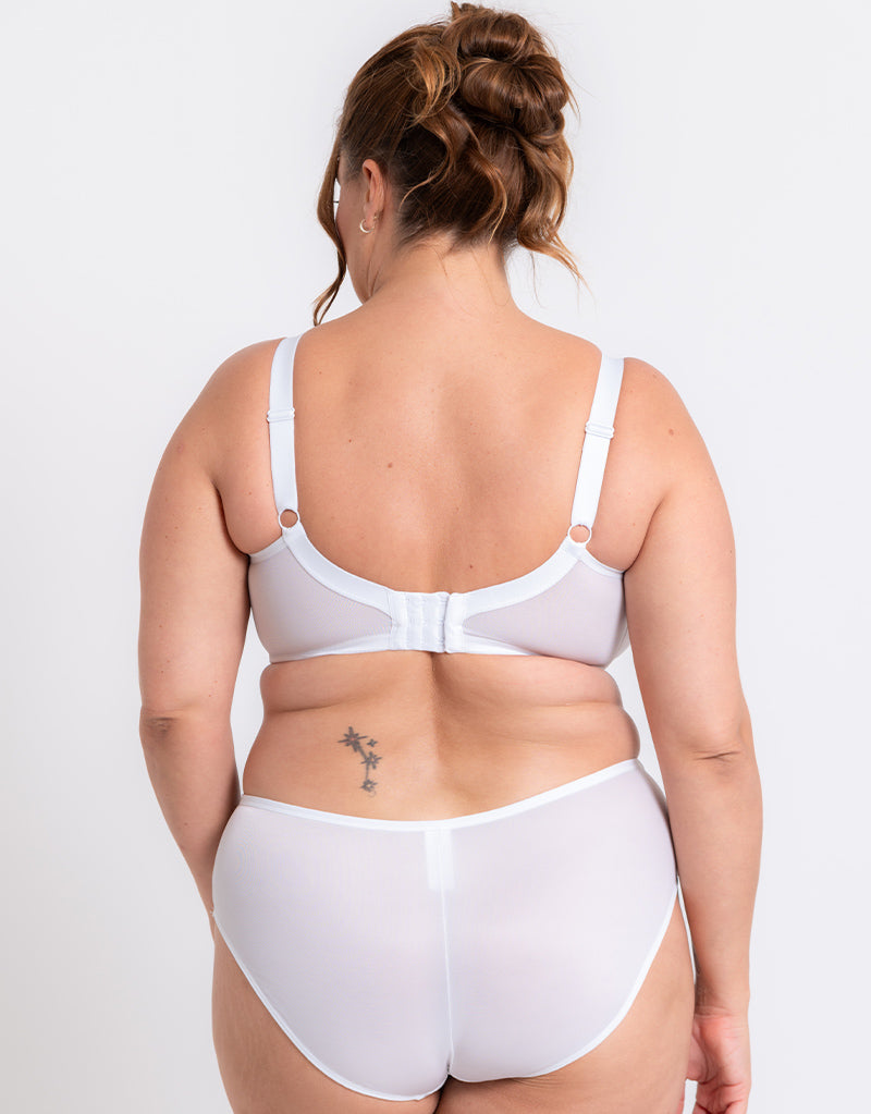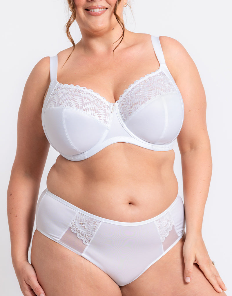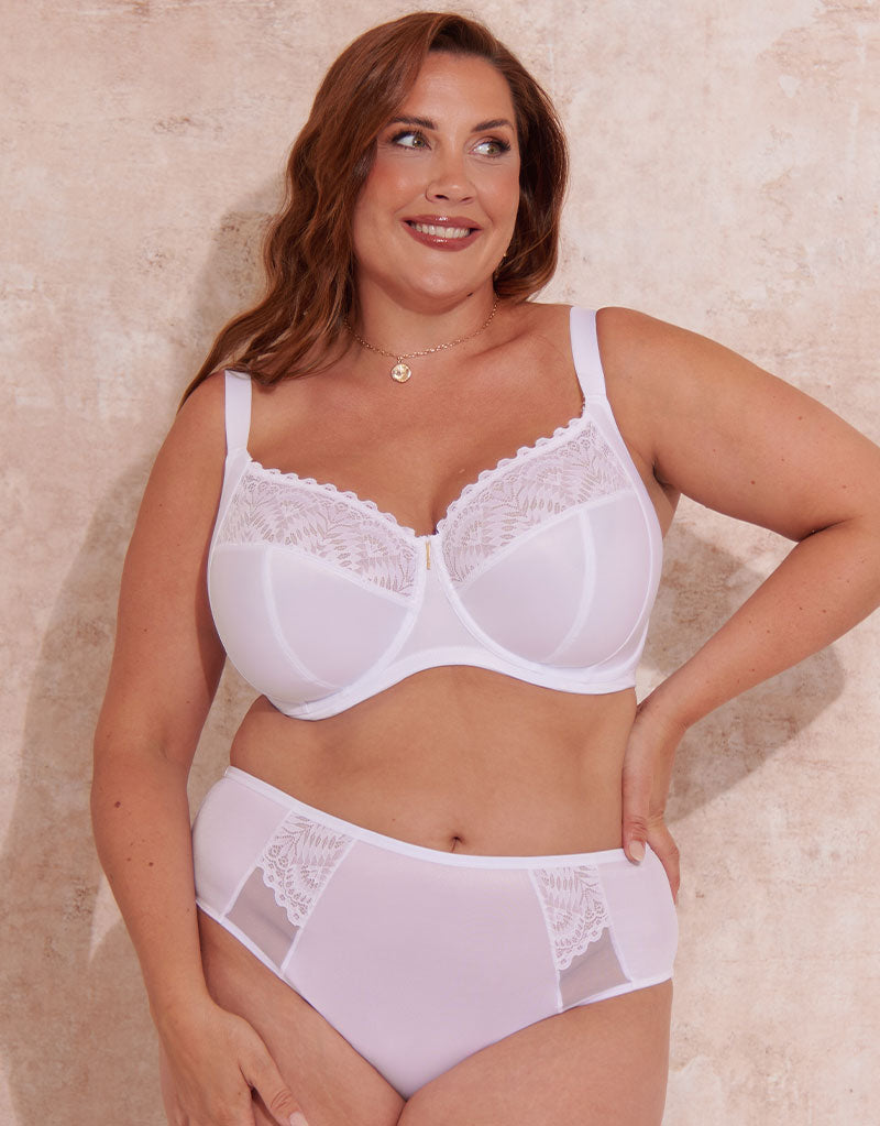 Upgrade your everyday bra-drobe with Adella's Athena full cup bra in White. The fuller coverage cups provide a secure fit for fuller figures, with deep powermesh wings and wide, non-slip straps. Non-padded, 4-piece cups use a side support panel and lamination in the bottom sections to give gentle projection, with a supportive and comfortable fit in premium fabrics. Finished with a pretty lace top cup to keep it feminine and elegant, and a slimline matte gold charm to the centre front.