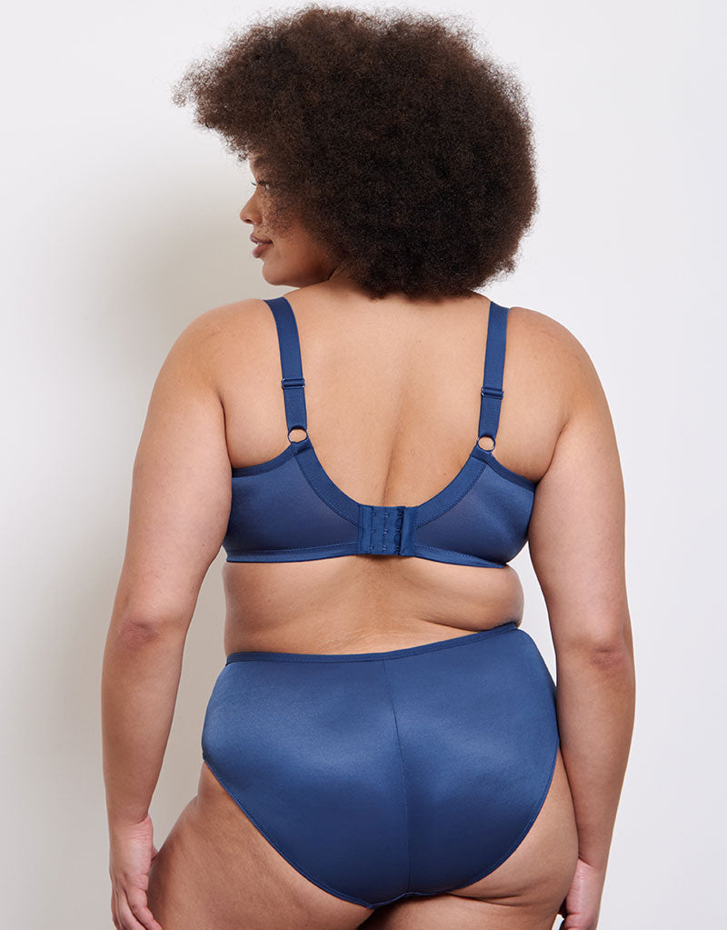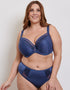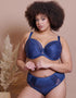 Adella's Hera full plunge bra brings glam stye to the fuller figure world. Available up to a K cup in a sleek and sophisticated navy blue, this fuller coverage plunge style provides a lower neckline without compromising coverage or support. Get an uplifted and rounded shape with laminated bottom cups, combined with lightweight mesh top cup and lace detail to elevate the look. Complete with wide shoulder straps and deep powermesh wings to ensure a firm but comfortable, non-slip fit for all day wear, and slim matte gold charm at the centre front.