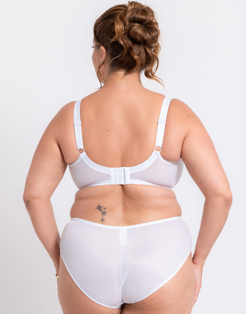 Be ready for any occasion with the Adella Hera full plunge bra in White. This crisp, fresh style is a must-have addition to any fuller figured lingerie drawer, with a lower centre front that doesn't compromise on support, fit or comfort. Laminated cups ensure a rounded, uplifted shape that keeps you in place all day long, alongside deep powermesh wings and non-slip, wide shoulder straps. Finished with a lightweight mesh and lace top cup panel and slim gold charm to the centre front.