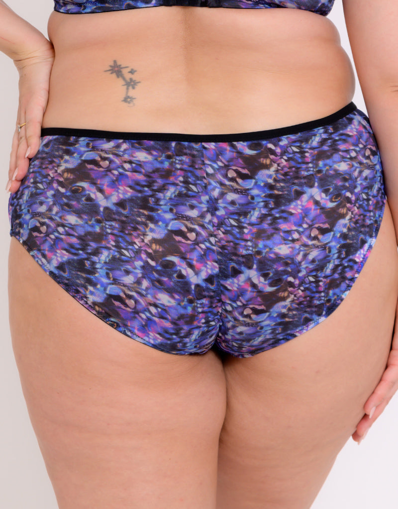 The Adella Kin Aura full brief is stunning in an abstract blue print and a simple, modern design using mesh panels at the hips. A full brief shape offers everyday comfort and style, in soft fabrics that feel like a second skin while offering total coverage for a secure fit.