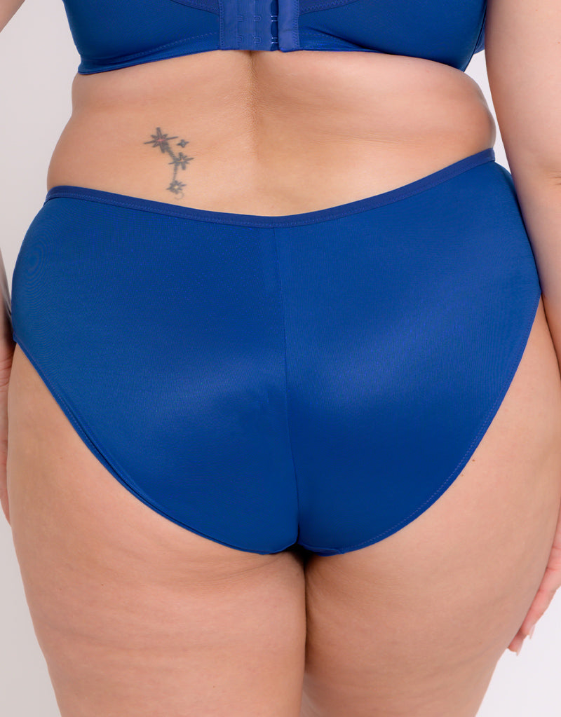 Adella's Kin brief is beautiful in cobalt blue, offering a mid-rise waist with a full coverage bottom. Comfortable and pretty in soft fabrics with lace detail to the hips that frames your curves perfectly.