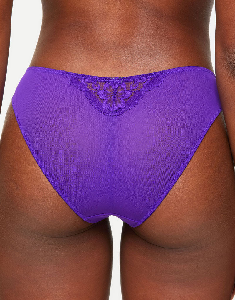 Finish your set off in style with the Ann Summers Sexy Lace brazilian brief in dark purple. This low rise, cheeky cut knicker is the perfect coordinate, in soft mesh with lace trim detailing. Made from a minimum 30% recycled fibres and mesh that contains 50% recycled yarns.