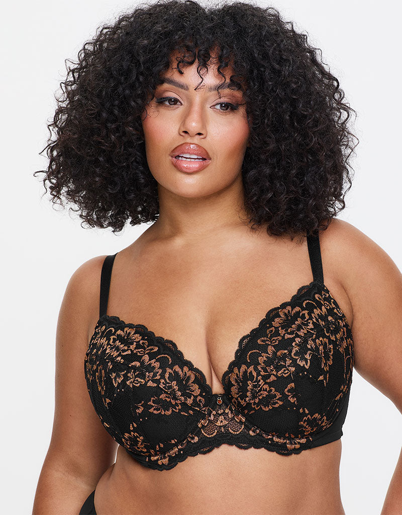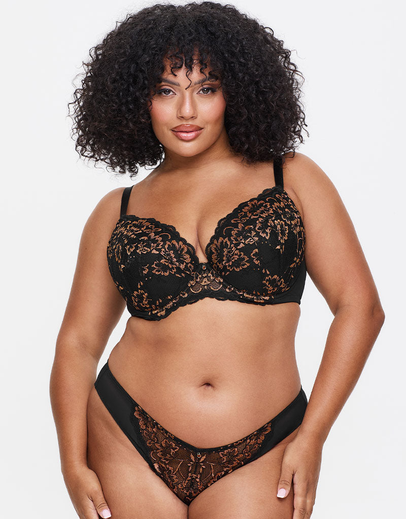 Fall for the Ann Summers Sexy Lace padded plunge bra in a gorgeous Black/Bronze colourway. Black floral lace is highlighted with metallic bronze threads, while underwired cups are foam lined and cut in a 3-part shape to give an uplifting, supportive fit.