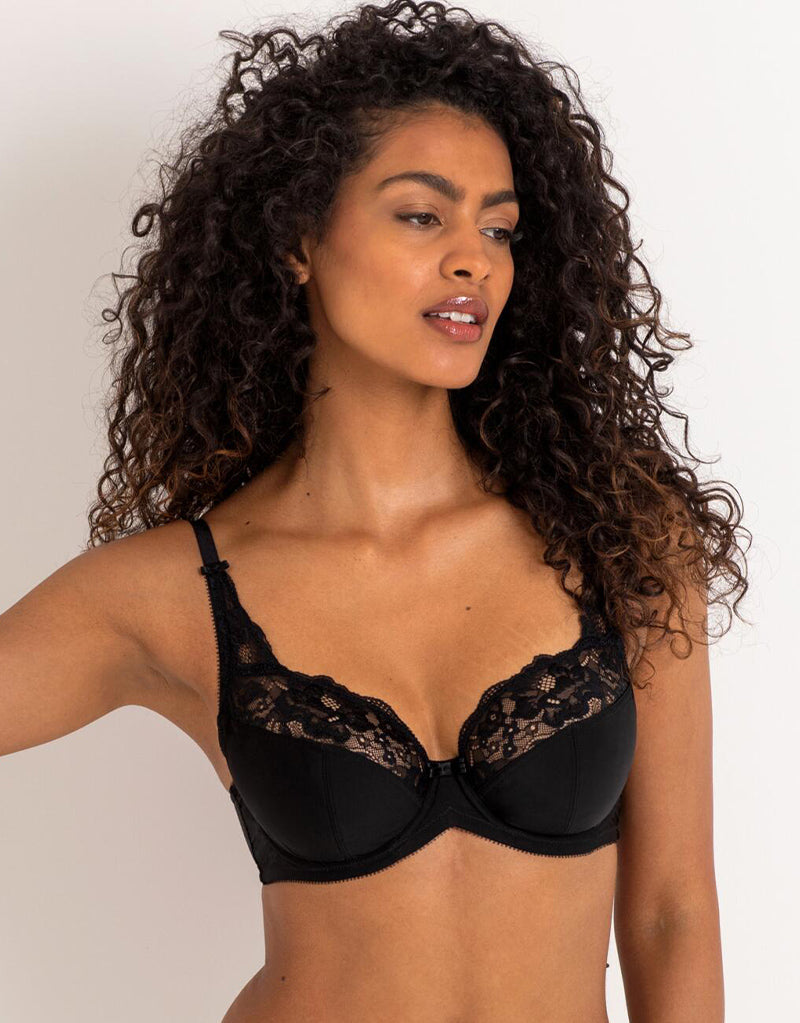 The Flamenco full cup bra from Charnos is perfect for everyday in black, complemented with lace top cups. The fuller cup structure with a higher apex shape offers a secure fit while still feeling elegant and lightweight, giving D+ busts uplift and support with a softly romantic vibe.