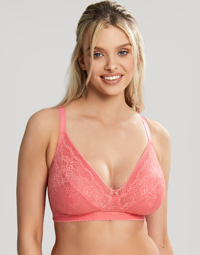 We're ready for warmer days with SS23's Sunkiss Coral hue of the Alexis non-wired bra from Cleo by Panache. This beautiful bralette is made from a delicate floral lace with an inner mesh lining to add support and shape, with triangle cups to give fuller busted babes the chance to wear on-trend lingerie! Complete with fully adjustable shoulder straps featuring a J-hook for racerback conversion, as well as a hook and eye back fastening.