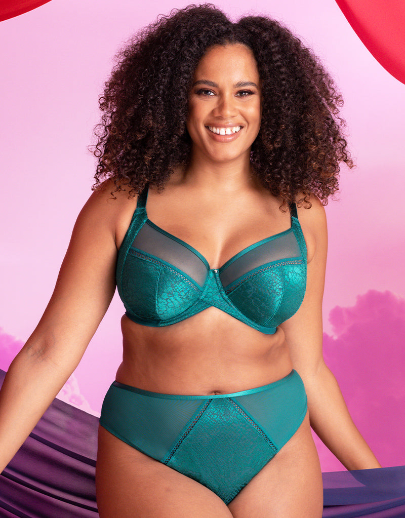 The Amaze high waist brazilian brief from Curvy Kate is gorgeous in a Verdigris green. Made from soft mesh for a comfortable fit with a high rise waist, high leg and cheeky rear that flatters your curves. Styled with a subtle shimmer snakeskin print fabric to the front panel.