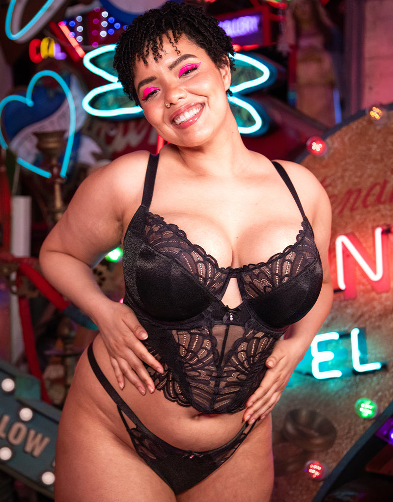The addition of a stretch lace top cup adds a touch of modesty, with a longline stretch lace band that hugs your curves and snatches your waist, making it perfect for styling as outerwear. A shimmery finish to the fabric feels luxe, while a keyhole to the centre front lightens the look - pair with your fave jeans or skirt for a striking outfit!