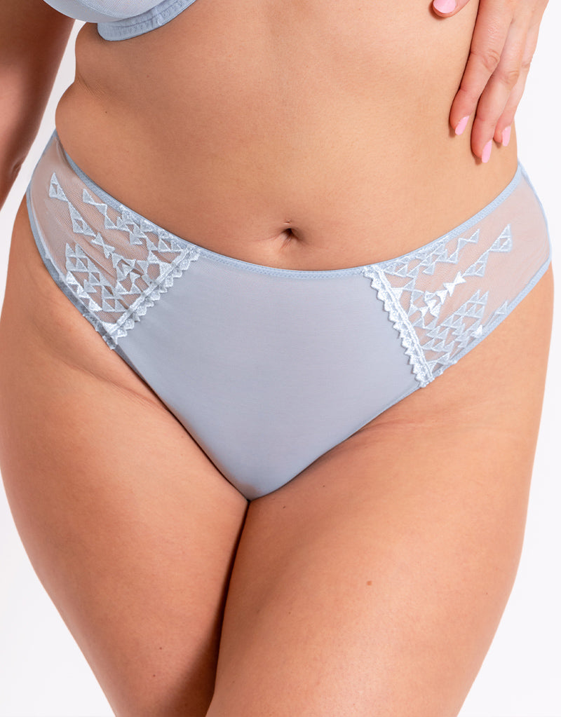If you like a thong but prefer a bit more coverage, try the Curvy Kate Centre Stage deep thong. Styled in a crisp icy blue, the soft mesh with geometric embroidery detail is comfortable on the skin, offering lower coverage at the back for minimal VPL while providing coverage and comfort in the front.