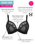 The Centre Stage plunge bra from Curvy Kate is a new shape for the brand, offering a fuller coverage fit with 4-part cups and side panels for incredible shape and support. Delicate geometric embroidery along the neckline frames your cleavage, with a curved centre front for comfort. Centred shoulder straps sit narrower on your frame to reduce strap slipping and give a lovely centre-front shape to your bust.
