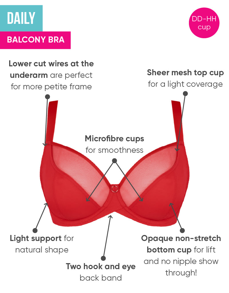 Everyday comfort and style just got an upgrade with Curvy Kate's Daily Balcony bra in Flame Red! This punchy hue adds some fun to your lingerie collection, cut in a lower coverage balcony for moderate support and a chic, modern design. Laminated bottom cups offer fabulous shape to your bust, with a lighter mesh top cup for a fun and flirty finish.