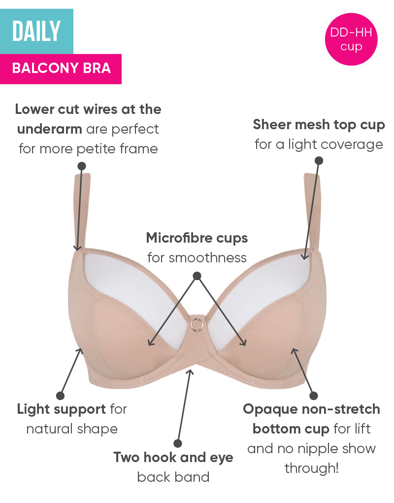 Looking for effortless everyday style? Try the Curvy Kate Daily balcony bra! The soft latte hue is ideal for everyday wear, made from soft mesh and microfibre for a smooth and comfortable fit with natural shape and a lower cut underarm. The perfect fuss-free bra for DD+ cups!