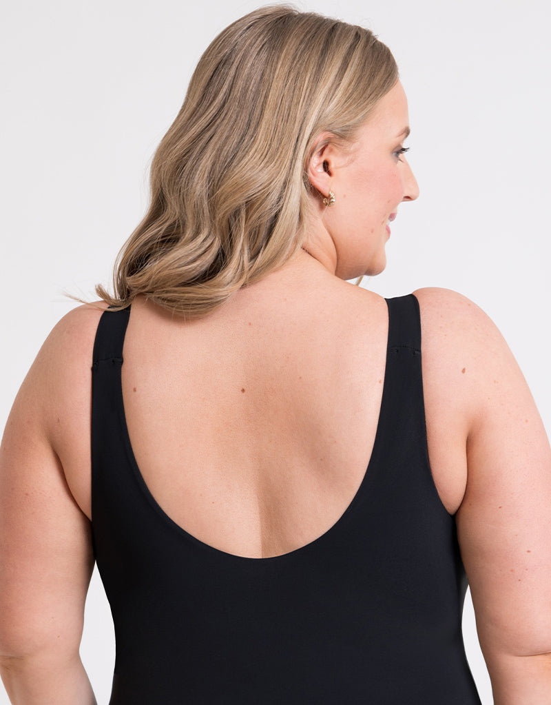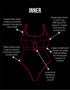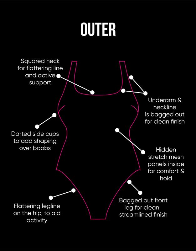 An inner front fastening with one hook and eye at the front of the elasticated band is designed to make it easier to pull the suit up and down, and still give incredible support when fastened.