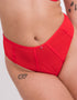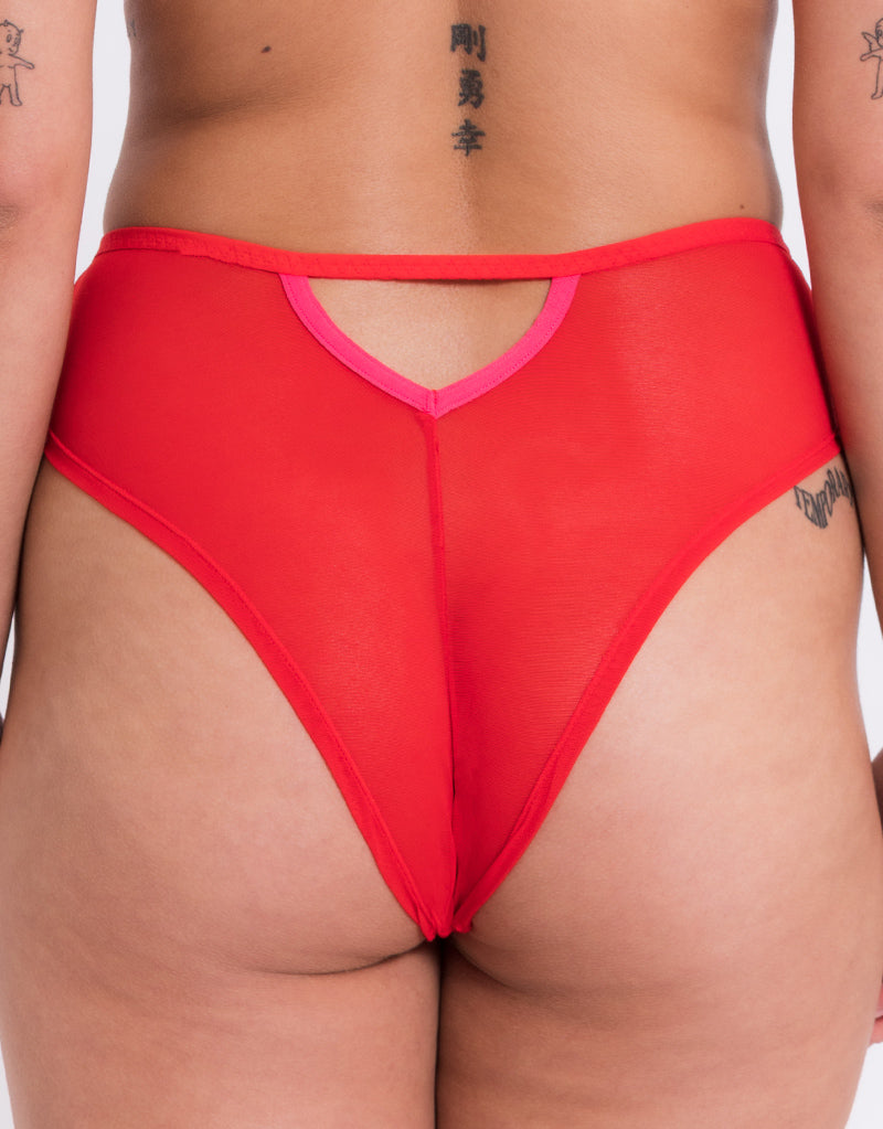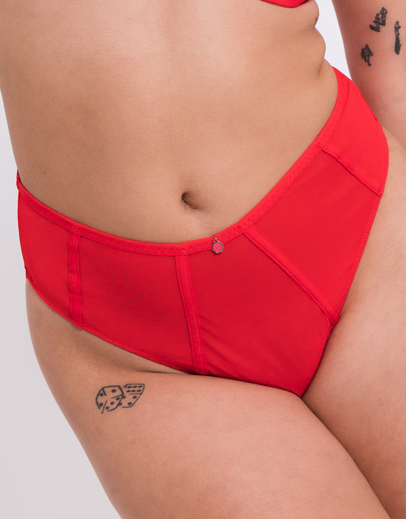 No look is complete without the matching brief! The Curvy Kate Elementary high waist brazilian brief is sexy in sheer red mesh, offering a higher rise waistband for added coverage in the front. with a higher leg line and a brazilian cut to the back that's cheeky and flatters your curves.