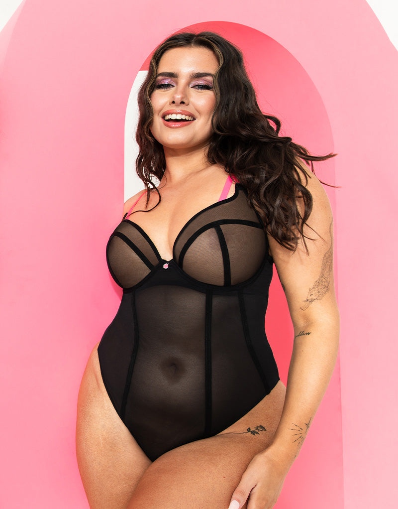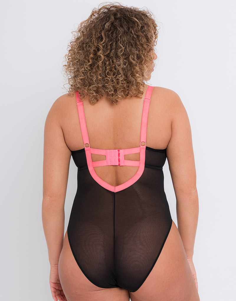 Get ready to stun in Curvy Kate's incredible Elementary body! You loved the bra, now get the body - using soft, sheer mesh for a sexy style, with a pop of colour from the pink contrast strapping. Bold style lines give a modern vibe and contour your curves, while the underwired cups ensure uplift and a great shape for DD+ sizes! The cute gated back band detail looks delicate while still ensuring the best fit and support, while the stretch mesh body is comfortable and easy to wear. Complete with a hook and eye gusset to adjust the length.