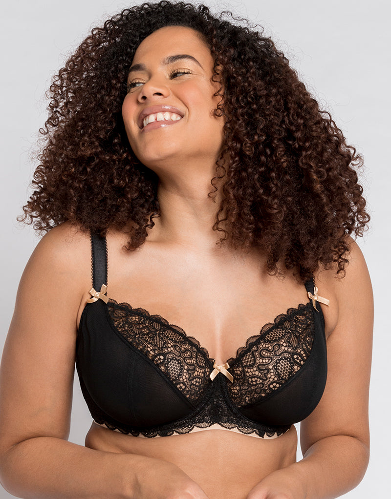 The Curvy Kate Ellace balconette bra is a perfect everyday style, with double layered bottom cups for reinforced support and lift. Stretch lace top cups mould perfectly to your bust, perfect for fluctuations in size throughout the month as well as comfortly accommodating asymmetrical breasts. Styled in black with champagne details, it's both sophisticated and sexy.