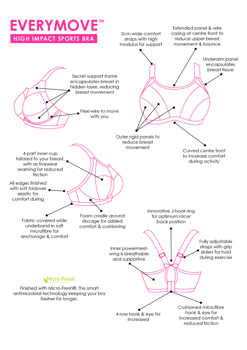A 4-part inner cup structure with a secret support Y-frame keeps your bust secure from a 30F to 40K, with triple layer fabrics and flexi-wires that move with you throughout your workout. The flexible wires are covered in a soft wire casing and padded cradle area for a barely-there feel on the body. 3cm wide, fully adjustable shoulder straps reduce strain and pressure on the shoulders, with an innovative J-hook position to clip them into racerback for even more support. A lower scooped underarm ensures freedom of arm movement, while a cushioned hook and eye fastening and fold over elastics provide maximum comfort and a soft feel against the body, so you can focus on your exercise goals.