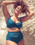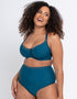The First Class high waist bikini brief from Curvy Kate brings the retro vibes with its higher rise shape to hug your curves, giving an hourglass silhouette. This beautiful deep teal colour complements any skin tone, with a criss-cross trim at the waistline to add interest. Made using 41% recycled fibres, plus Xtra-Life Lycra for a longer lasting life.