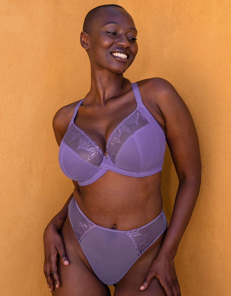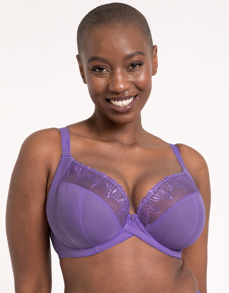 Curvy Kate's Flare full plunge side support bra returns in a pretty amethyst purple. The 4-part cups provide a secure fit that encapsulates each breast while still giving a low neckline, with amazing shape thanks to the side support panels. Non-stretch fabrics keep it uplifting and supportive, with flame inspired embroidery featuring a subtle sparkle in the yarn.