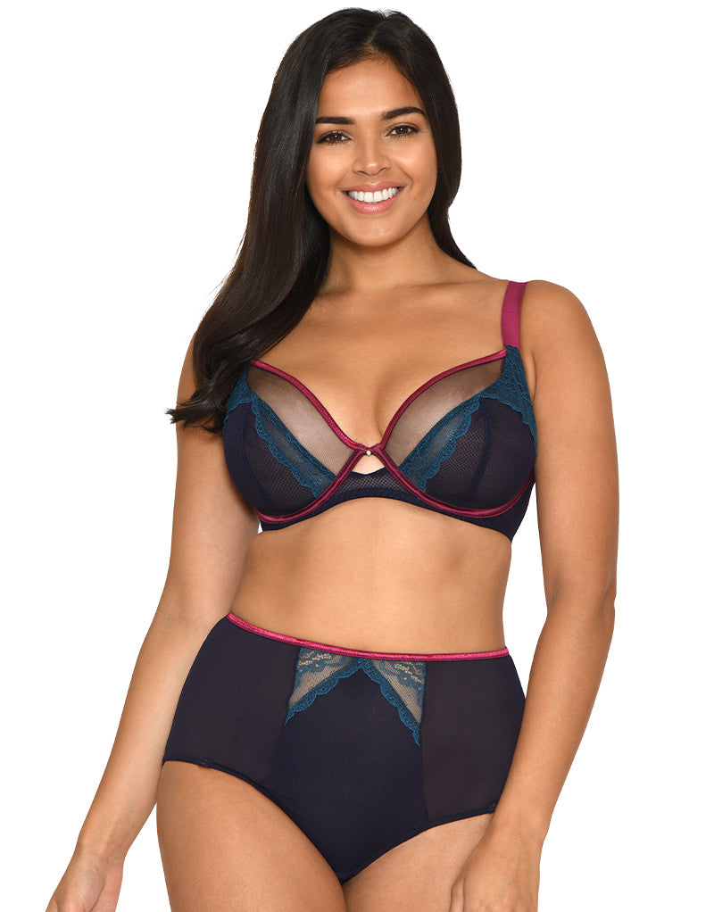We can't get enough of the beautiful new Flutterby plunge bra from Curvy Kate. Delicate lace meets ultra-sheer mesh, with contrast binding in the hottest colours this season. Plunging cups meet a sweet keyhole detail and petite charm, adding a luxe finish to this beautiful, supportive bra.