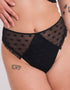 Curvy Kate's Frill Me high waist thong is delightfully girly in polka dot black mesh, which contains recycled fibres, complete with frill trims and contrast pink bows to the back. Cut to give a little more tummy coverage while remaining cheeky at the back!