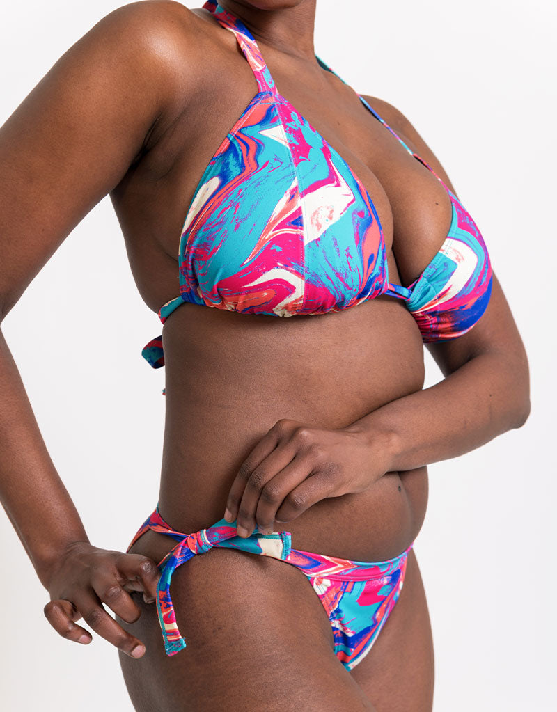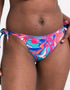 Holiday in style with the Curvy Kate Ibiza string bikini brief, containing recycled fibres in an abstract marble print of pinks and blues. This cheeky cut bikini bottom features tie sides for the perfect fit, offering a classic vaycay look with comfort in mind.