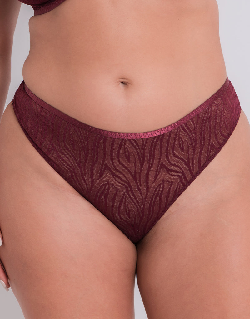 Curvy Kate's Lace Daze brazilian brief is stylish and sophisticated in a deep claret hue. Easy to wear as an alternative to black, this soft zebra effect lace brief offers a comfortable fit for everyday, complete with a stretch lace back with lower coverage and a scalloped edge to sit smoothly across your curves.