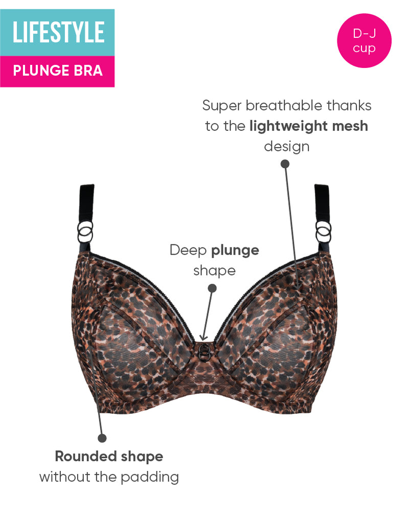 Curvy Kate's well-loved Lifestyle plunge bra just got a sassy update with this fun leopard print! Styled in the same sheer, single layer dynamic mesh to give a supportive fit with a barely-there feel, in rich brown hues. The 3-part cup gives a nicely projected shape to your bust, while the plunging neckline offers lower coverage without compromise.