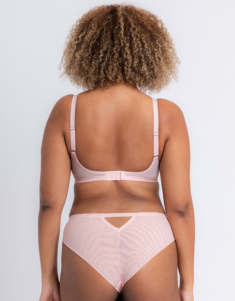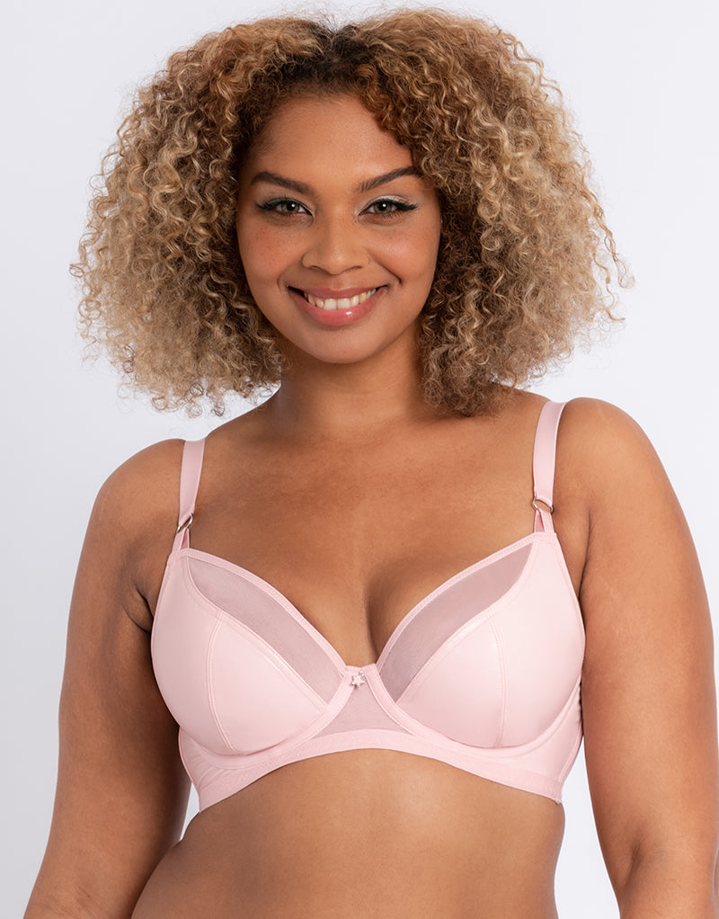 Pretty in pink - Curvy Kate's Lucky Star plunge bra returns in this romantic blush pink hue! The soft faux leather meets sheer mesh panelling to give a sexy and flirty style, while the 3-part cups and lower centre gore gives a gorgeous shape with incredible cleavage. Complete with a wide elastic trim on the underband for extra support!