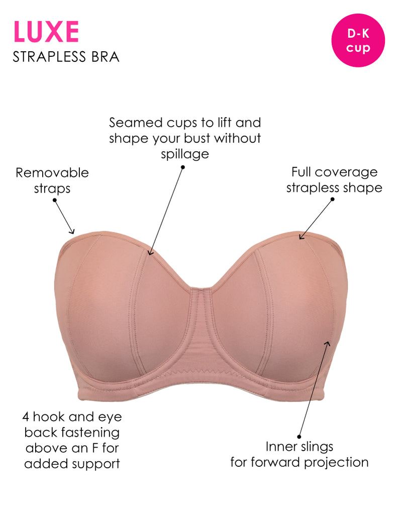 The Curvy Kate Luxe strapless bra in Latte is the perfect foundation for a whole range of outfits, with a no-frills fresh, sleek look. Detachable, multi-way straps that can be worn in a range of combinations as well as completely removed for gravity defying, strapless support. Offering fantastic uplift with a rounded shape thanks to the inner sling and vertical cup seams, and the silicone grip along the band ensures this is a strapless bra that won't slip.