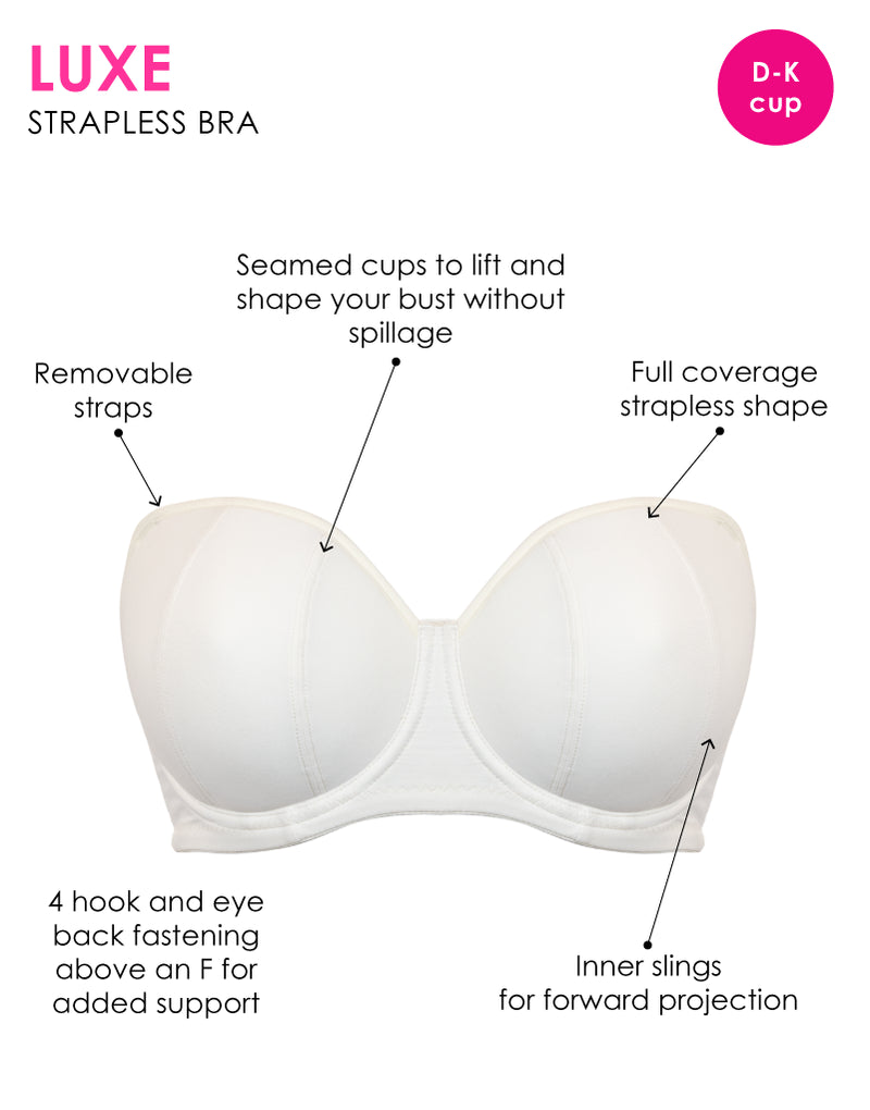 For perfect strapless support, look no further than Curvy Kate's Luxe strapless bra! This Pearl Ivory shade offers a clean, modern look with no fuss or frills, while maintaining the best fit, uplift and support with or without straps attached. The cups are lined with foam and use vertical seams and inner slings to shape and project your bust, while a silicone grip around the underband ensures a non-slip fit for a fully secure fit.