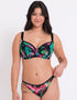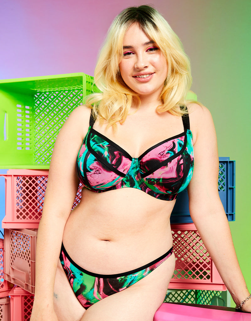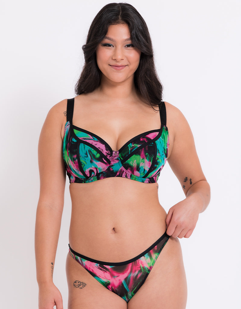 Curvy Kate's Reality Check tanga brief is made from fabrics containing recycled polyamide fibres. Cut in a low rise, low coverage knicker shape with a striking oversized marble print blending greens and pinks, trimmed by contrasting black binding to the waistband.