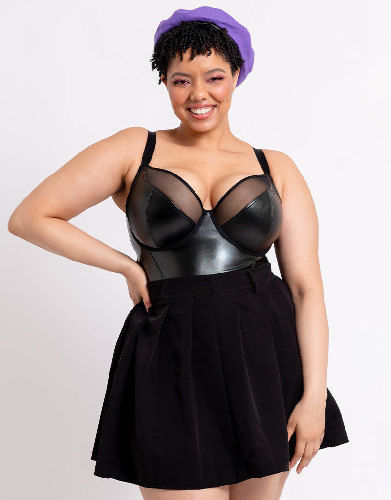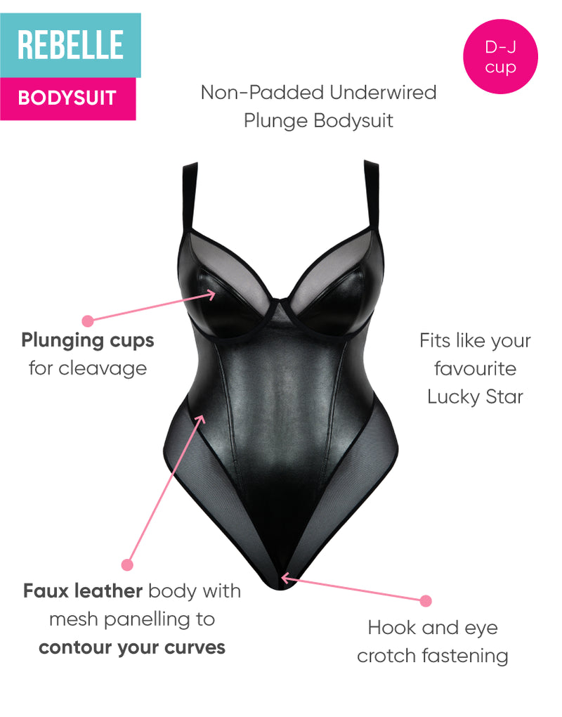 Curvy Kate have taken their iconic, sell-out Lucky Star bodysuit and brought her back with a fresh style in Rebelle! Just as fierce, fabulous and uplifting with more faux leather panelling and mesh accents to sculpt your curves and enhance your silhouette. The 3-part plunge cups are underwired to give perfect shape and lift, while the faux leather outer keeps it modest and perfect for styling as outerwear.
