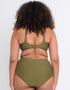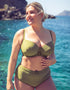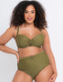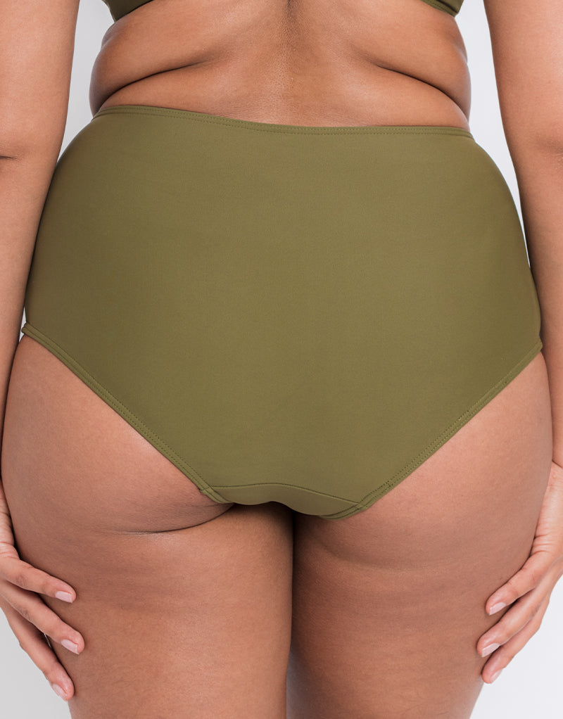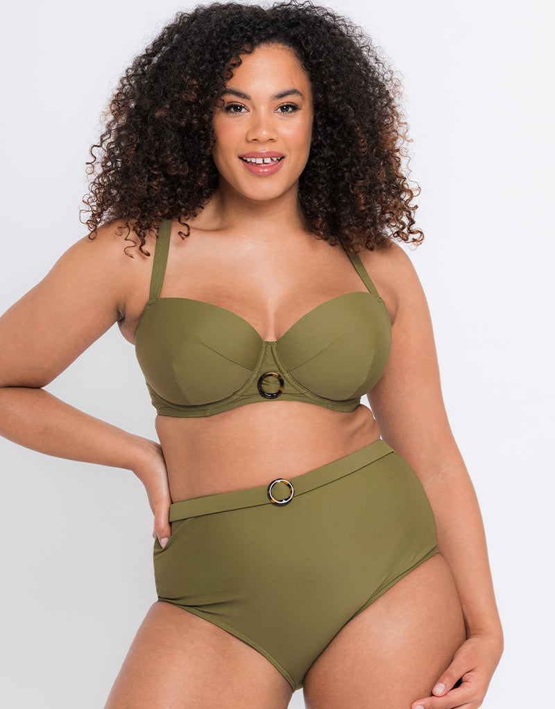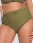 Get sophisticated style for your next holiday adventure with the Curvy Kate Retro Sun high waist bikini brief in olive, made using 39% overall recycled fibres and Xtra Life Lycra for longevity. This chic green hue is complemented by the tortoiseshell faux-buckle waistband detail, offering a stunning fit that sits high at your natural waist and provides full coverage.