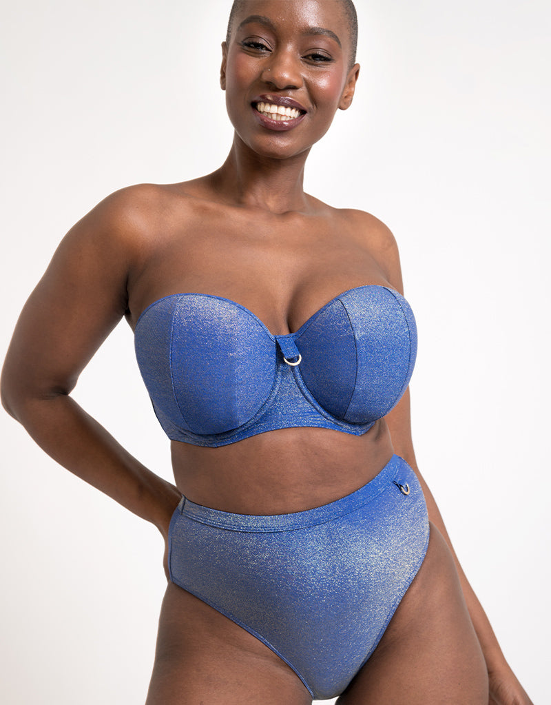 Whatever your next getaway destination is, be the best-dressed on the beach with the Curvy Kate Sapphire Seas bandeau bikini top. In a shimmering blue sparkle fabric it brings glitz and glamour, and contains recycled fibres too.