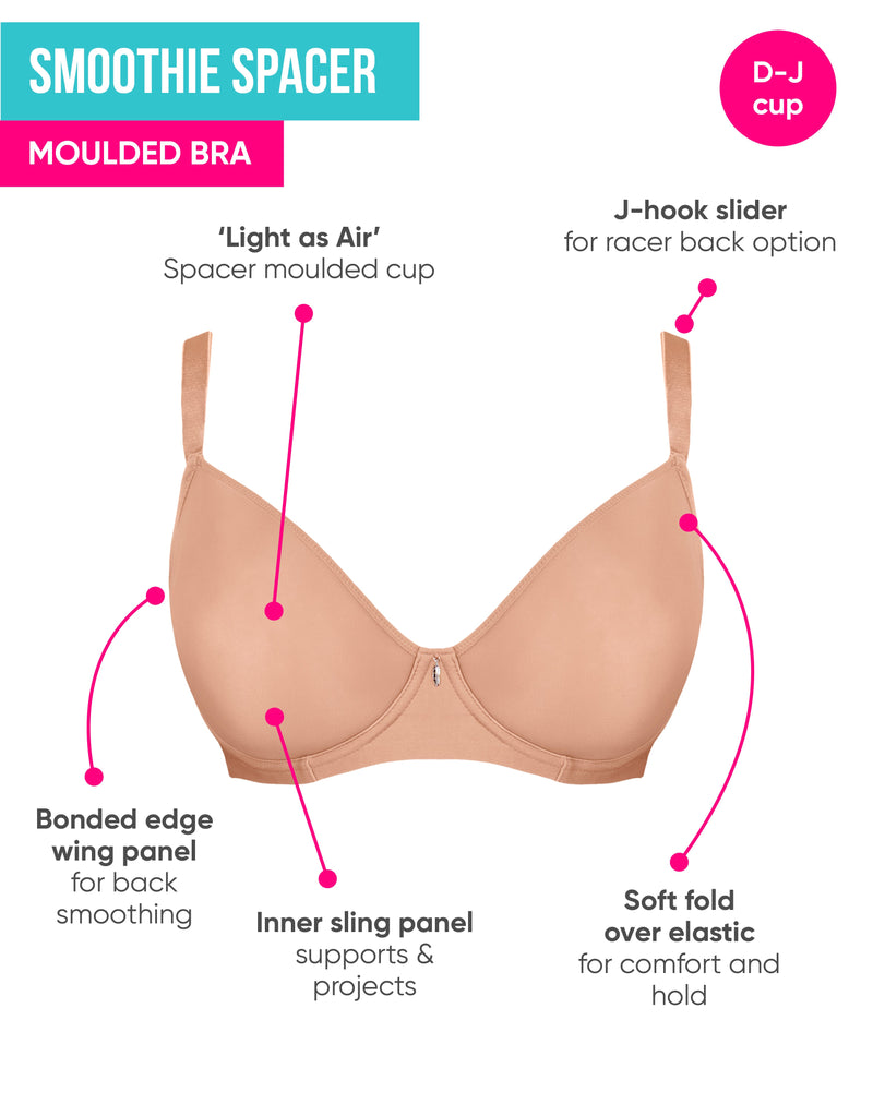Introducing Smoothie Spacer, Curvy Kate's first spacer foam bra! This style is packed full of features and benefits with your needs in mind, offering a feather-light fit and feel against the body. The seam-free fabrics give a smoothing fit around your body, with a semi-sheer breathable spacer foam cup to sit discretely under clothes. Complete with a J-hook on the straps for wearing in racerback position as well as straight shoulder straps.