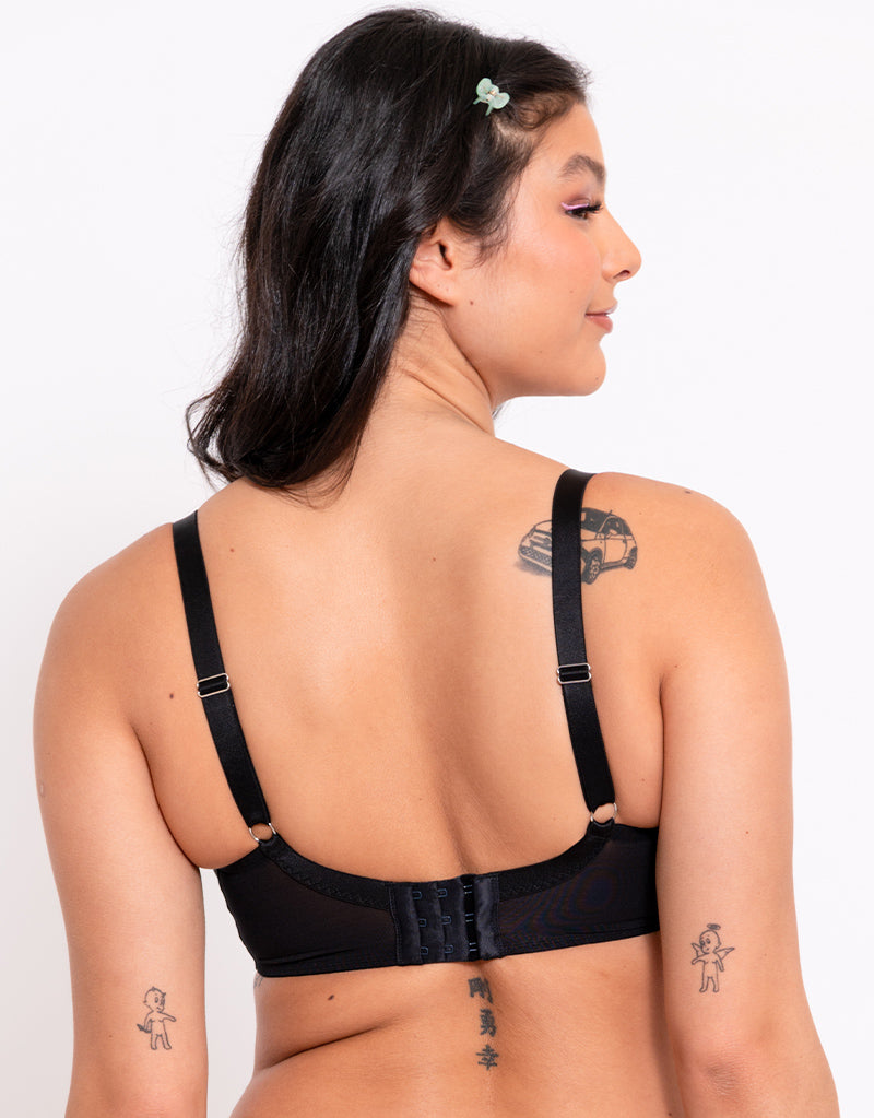 The Stand Out plunge bra from Curvy Kate was designed to give those of us with fuller busts the option to wear similar styles to what our smaller bust friends can. SS24's striking Black Multi colourway boasts sheer black mesh cups with darting and inner slings to shape and support, with oversized floral embroidery in punchy lime and lilac tones. Deep plunge cups and a high apex shape give a triangle cup effect, without compromising support and comfort for D+ sizes.