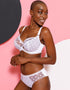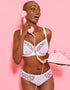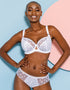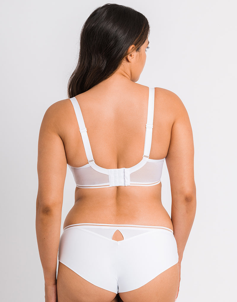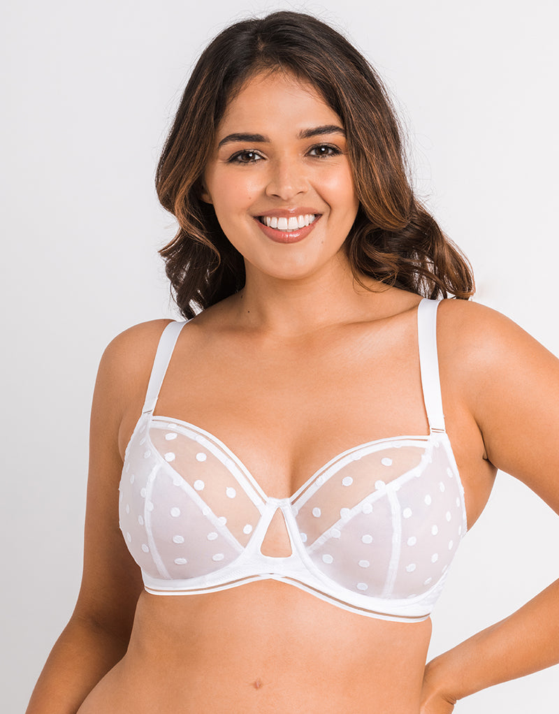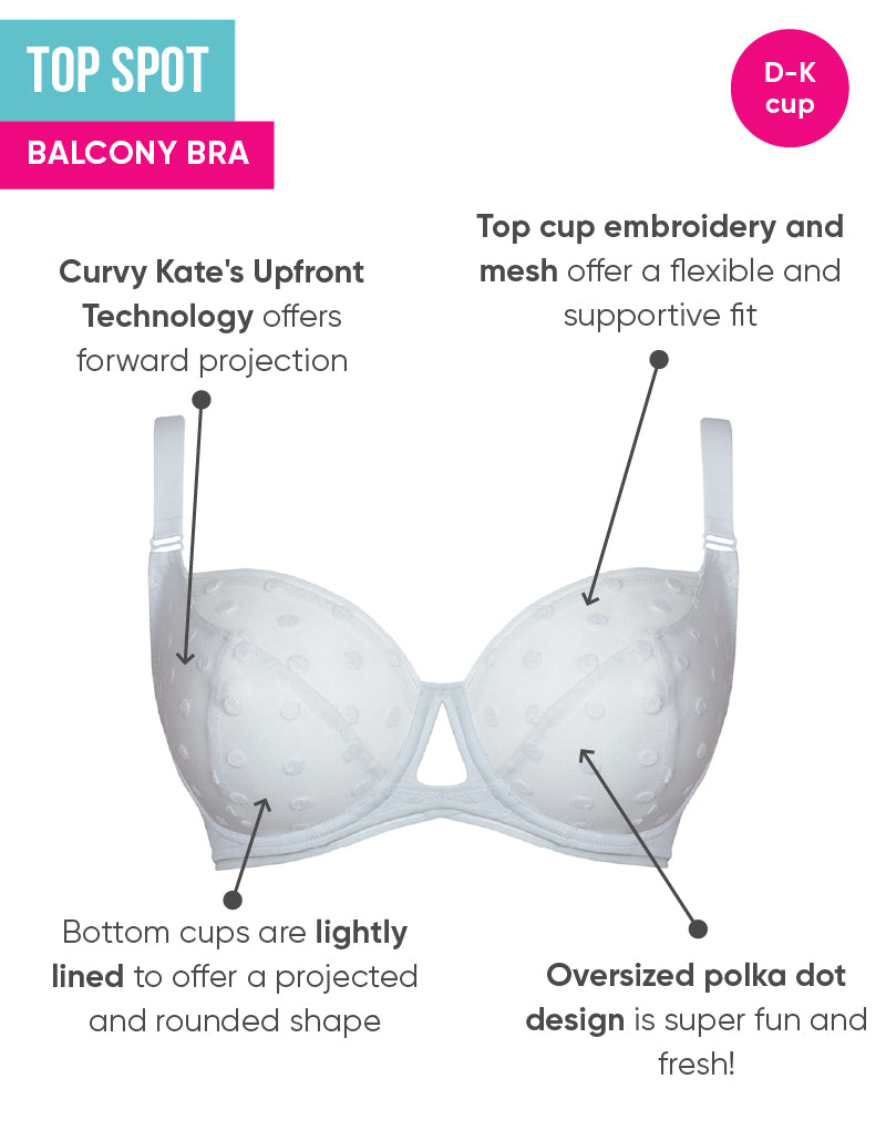 The Curvy Kate Top Spot balconette bra is cute in white polka dots, using proven Upfront Technology to shape and support up to a K cup. Lined bottom cups are supportive and comfortable, with a sheer stretch mesh top section to offer a perfect fit.
