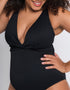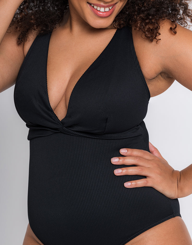 Shake it up, baby! Introducing your new favourite LBS (Little Black Swimsuit) - Curvy Kate's Twist and Shout non-wired swimsuit returns in timeless black, now made using 38% recycled fibres. The low plunge cups feature an extra lining to keep your bust secure and supported even without the wires, all in a luxurious ribbed fabric that feels gentle on your skin. A twist detail at the front enhances your waistline, while the multi-way straps can be worn straight, crossed or tied as a halter to suit your style.