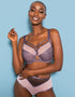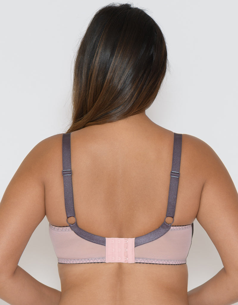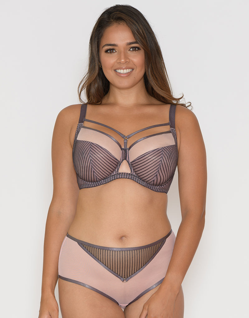 Curvy Kate's Victory Pin-Up bra brings vintage vibes to the modern times. A soft blush pink cup is overlaid with grey pinstripe fabric, meeting flirty harness detail to the overbust that looks great peeking out under a lower neckline. 4-part cups with side support panels ensure a fabulously projected shape with support and uplift.