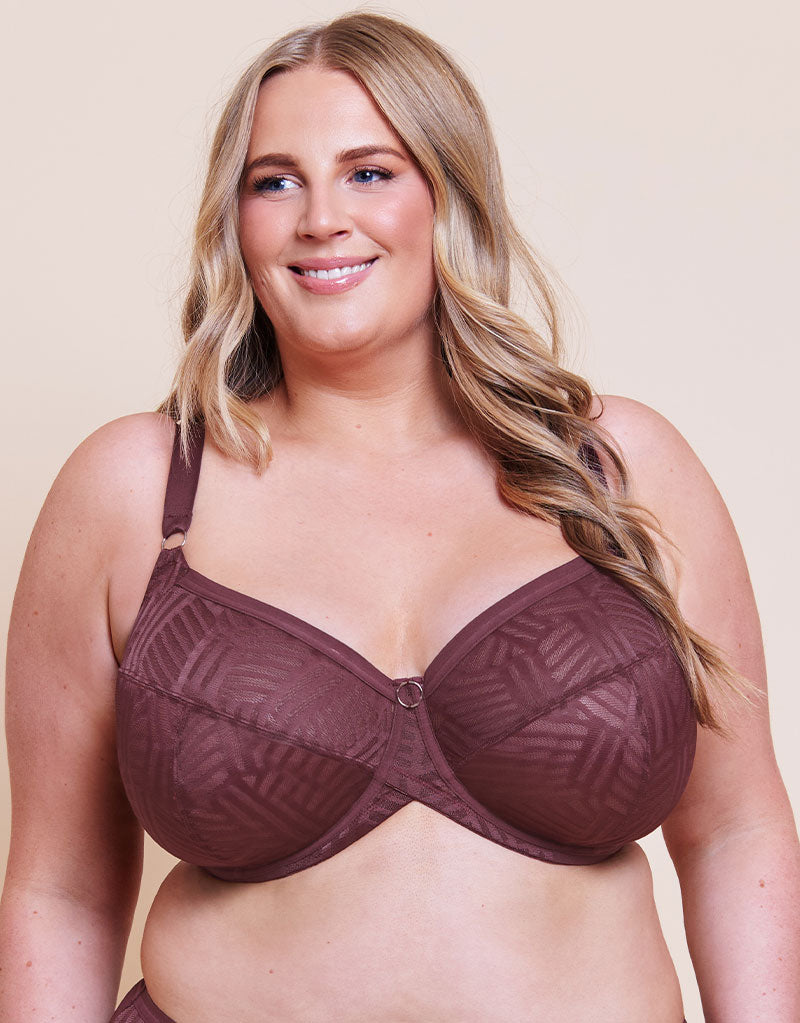 The Curvy Kate WonderFull Vibe full cup bra in Auburn is ultra modern with an all-over stretch geometric lace design. Smooth and flat for a sleek shape under clothes, with 4-part cups using side panels to give great shape. A curved centre front reduces underband roll and discomfort, and is finished with a deeper side wing made from a firm mesh to smooth and support.