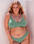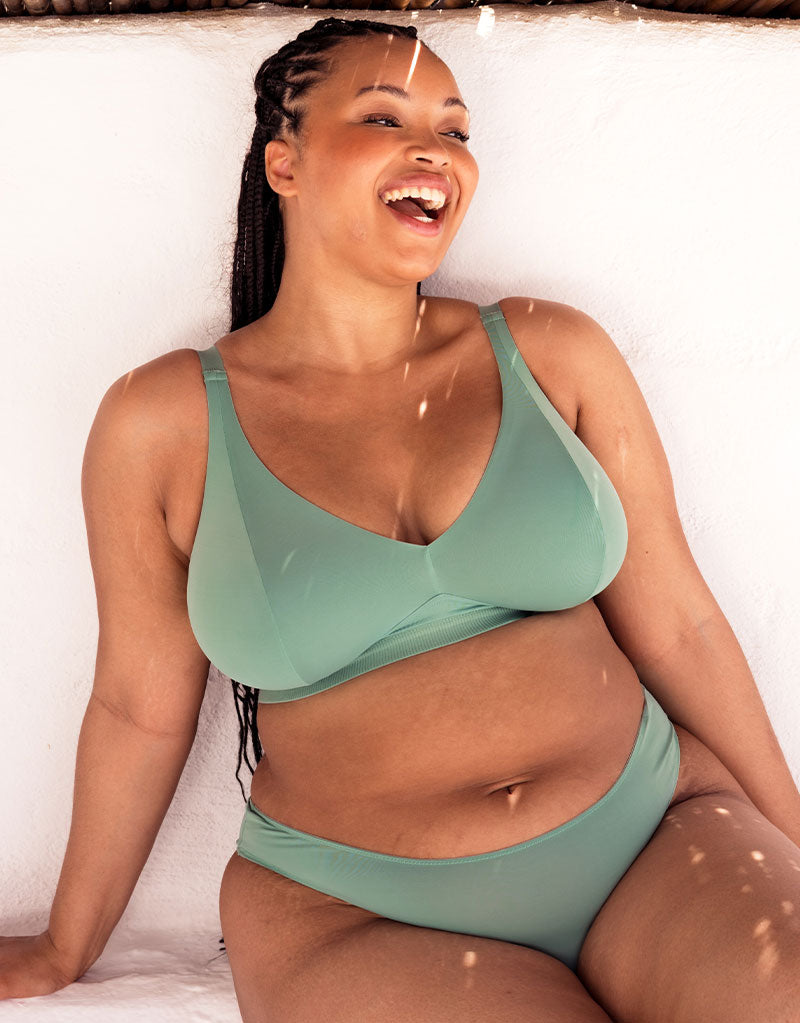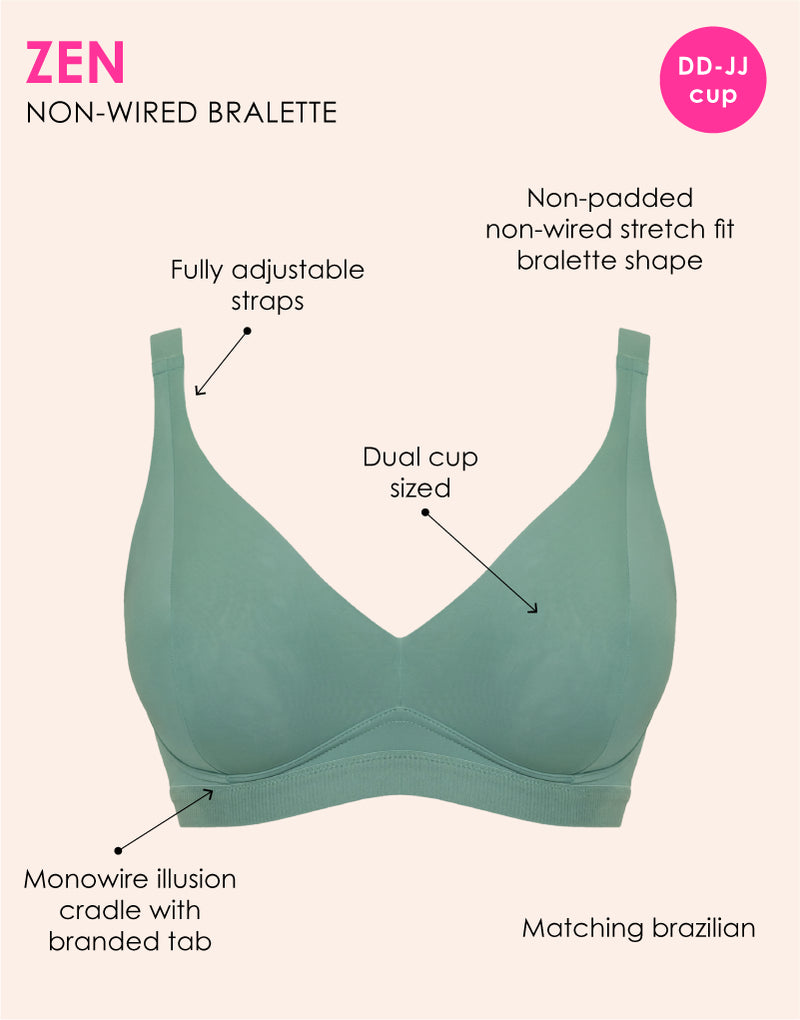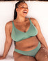 Curvy Kate's newest wireless shape is here with the Zen bralette in a beautiful sage green. Clean cut and oh-so comfy in buttery soft fabrics, this dual cup sized bralette has soft stretch for the most comfortable fit. Featuring double layered cups and a ribbed, deep underband to keep your bust secure despite the lower neckline.