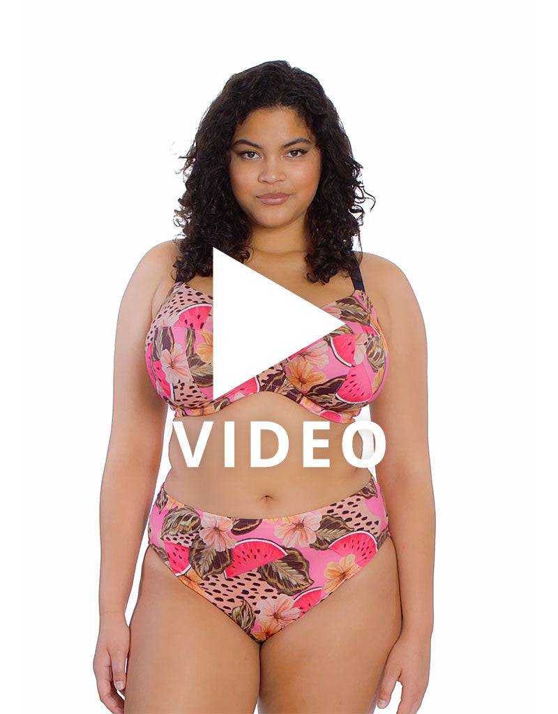 Celebrate your curves with the Elomi Cabana Nights plunge bikini top in a whimsical print of pink fruits, neutral florals and animal spots. The fuller coverage plunge cups are made from 4 sections to give incredible shape and support that fits just like your favourite bra, but for swimming! Lined with powermesh to keep things secure and offer all-day hold, so you can enjoy your vaycay without stress.