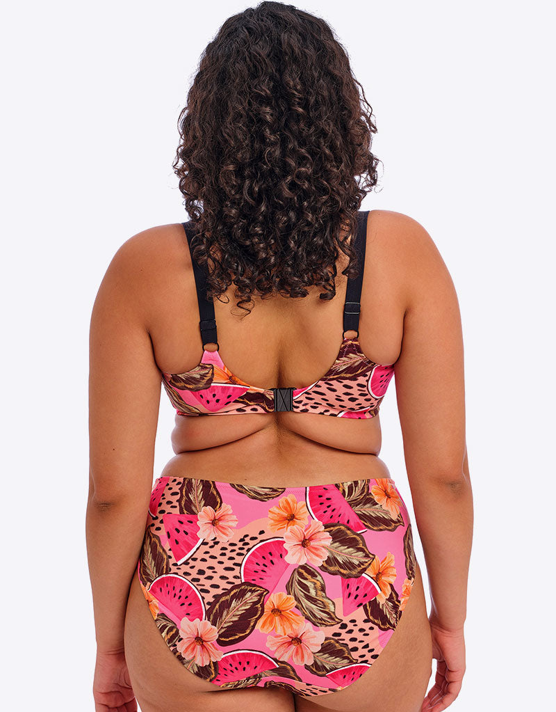 Celebrate your curves with the Elomi Cabana Nights plunge bikini top in a whimsical print of pink fruits, neutral florals and animal spots. The fuller coverage plunge cups are made from 4 sections to give incredible shape and support that fits just like your favourite bra, but for swimming! Lined with powermesh to keep things secure and offer all-day hold, so you can enjoy your vaycay without stress.