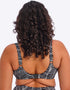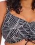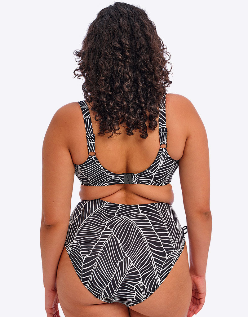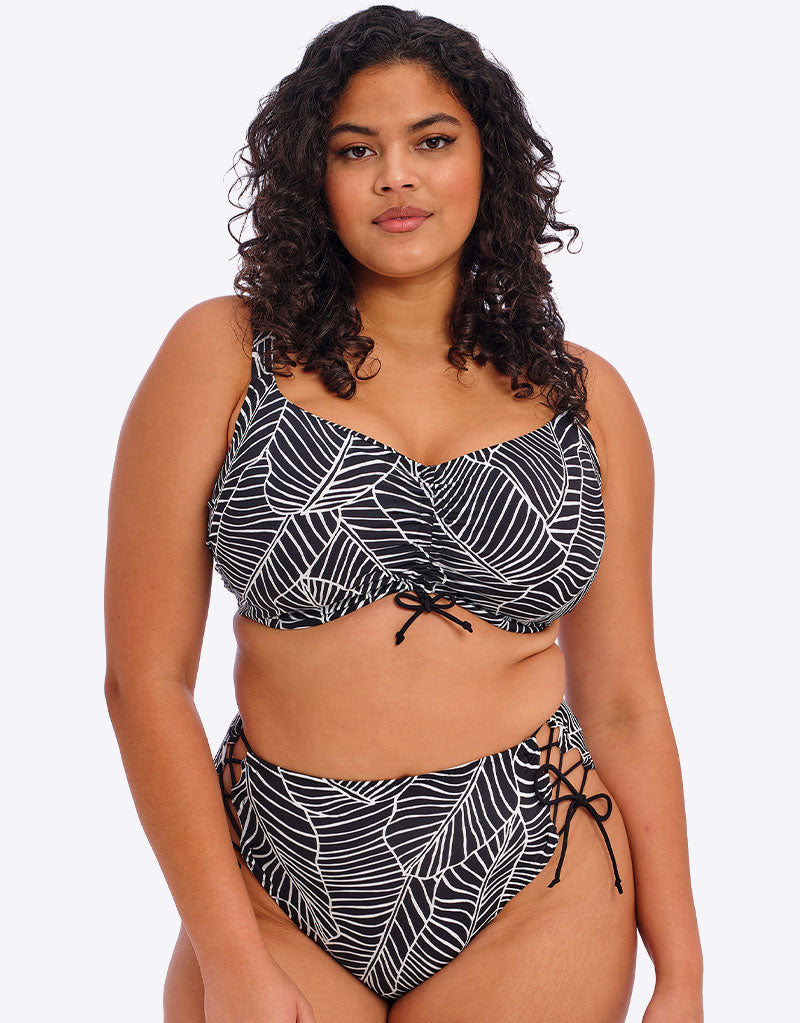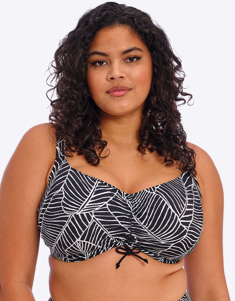 Elomi's Kata Beach bikini top is stylish and striking in black print, showcasing a linear white leaf print on a black base. The concealed cups are underwired and made in a 3-piece construction with vertical seams to give incredible shape and uplift for fuller figures. Overlaid with a lightweight printed fabric featuring a drawstring centre front which allows you to adjust the neckline shape and coverage ranging from a plunge to sweetheart shape, or a fuller coverage crop top inspired look.