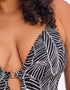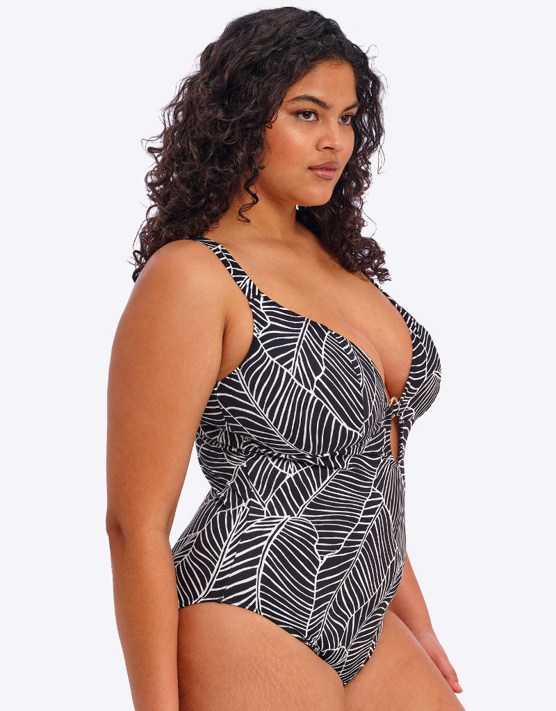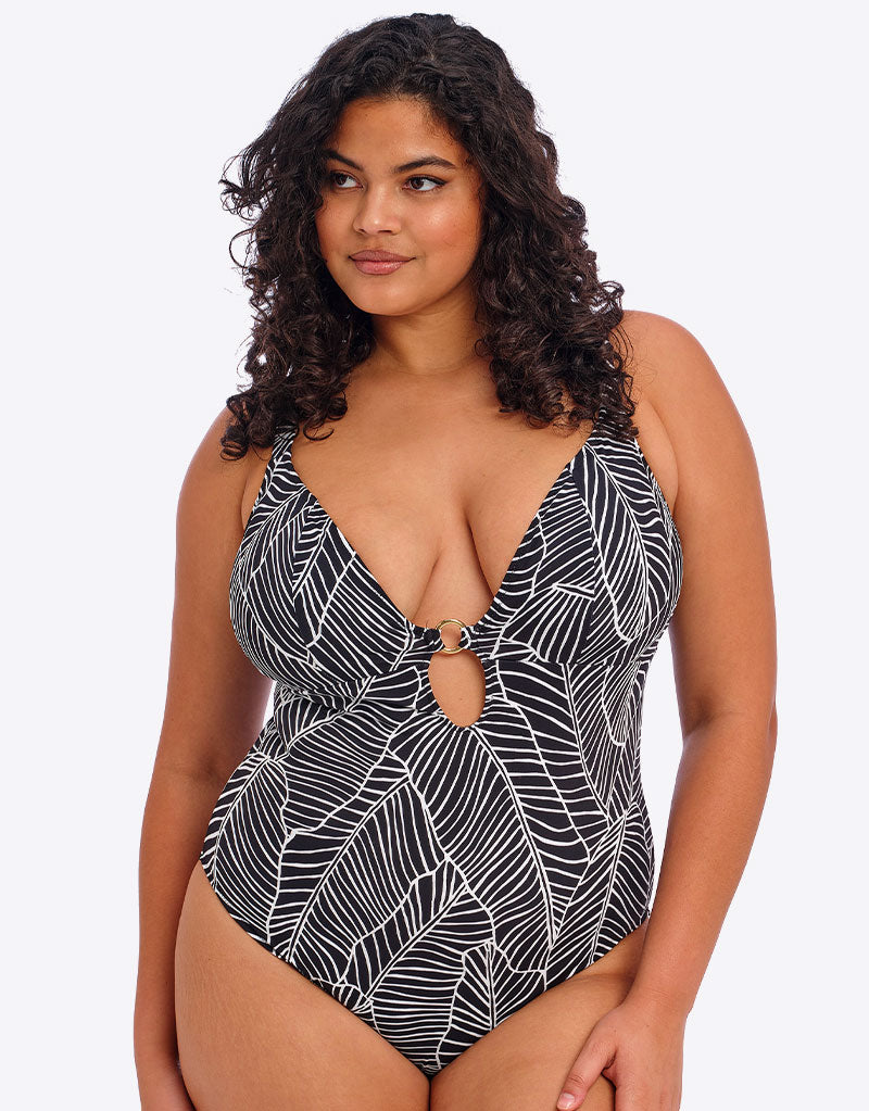 Embrace your curves and dive into paradise with the Kata Beach swimsuit from Elomi. This monochrome, linear leaf print design is super on trend with a metallic ring detail to the centre front, flaunting a low plunging neckline that gives support and comfort without the wires. An inner shelf bra ensures your bust is kept in place, and is bra-sized with dual cup sizes for a flexible fit.