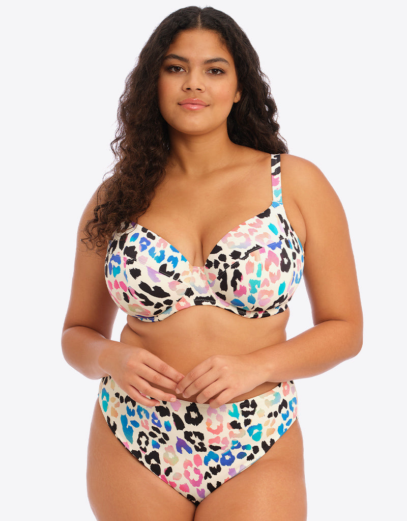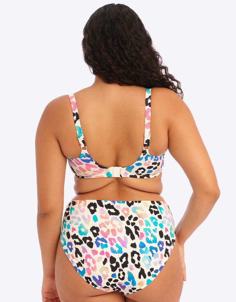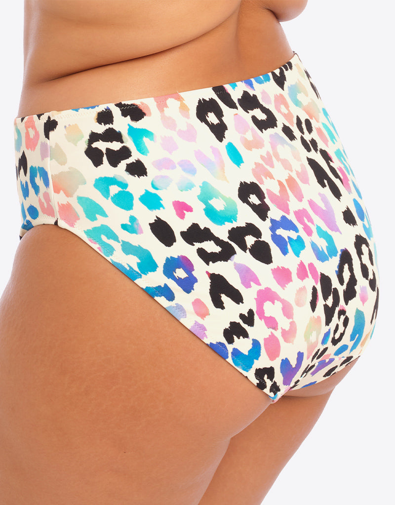 Elomi's Party Bay mid rise bikini brief is beautiful in ivory with a rainbow ombre leopard print design. This swimwear bottom is cut to give good overall coverage in a lightweight fabric, and is fully lined for comfort.
