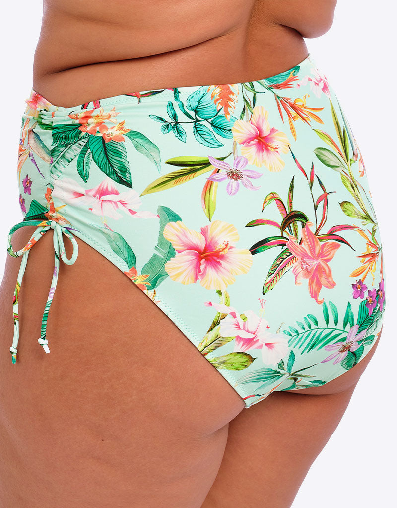 Elomi's loved adjustable bikini brief returns in the Sunshine Cove range. This high rise, full coverage swimwear bottom features drawstring sides so you can add ruching and raise or lower the leg line to suit your preference.