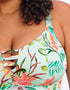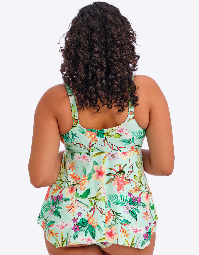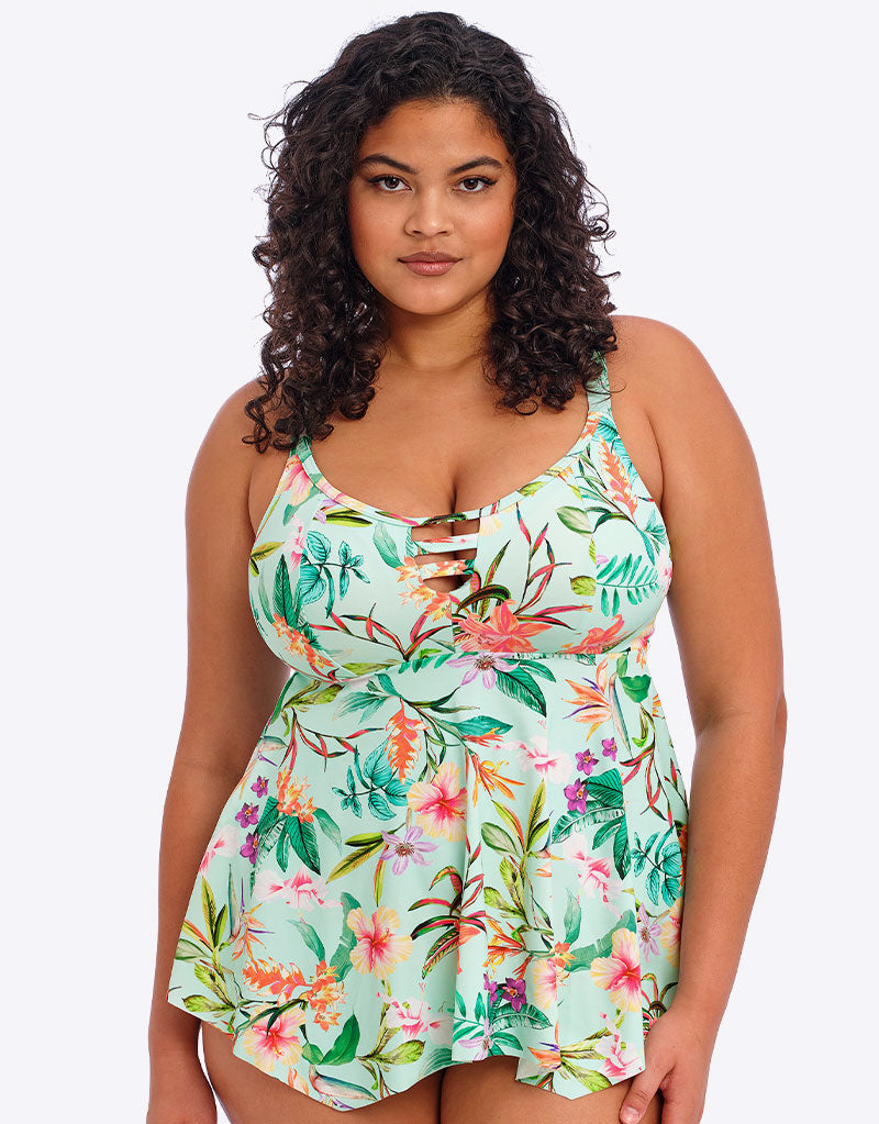 Prefer a little more coverage? Try Elomi's Sunshine Cove tankini top. Styled in a pretty aqua blue with tropical floral print, in a flared fit for comfort and flattering effect with a handkerchief hem. The non-wired cups offer gentle support and uplift, or you can wear it over a wired bikini top for added support. A light, seamless foam lining in the bust adds a rounded shape and smooth fit, complemented by cut-out detail at the centre front.