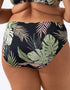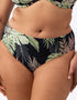 Slay your poolside style with the Elomi Tropical Retreat mid rise bikini brief. This gorgeous print of muted green and pink palm leaves pops against the black base, in a comfortable swim bottom shape that gives modest coverage without feeling frumpy.