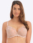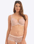 The Fantasie Aubree side support bra is gorgeous for everyday style in a warm, natural beige hue. Stunning lace gives a romantic, luxurious feel with two-tone thread for a subtle shimmer effect.